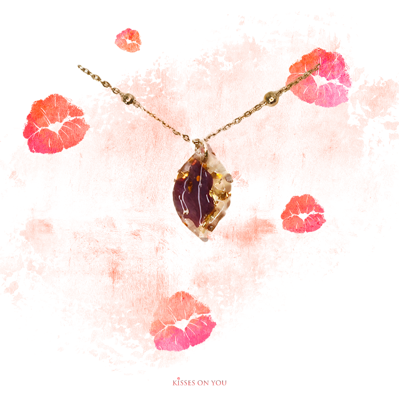 Handmade resin set pendant with real kiss shaped dried and pressed rose petals with gold leaf and sparkles